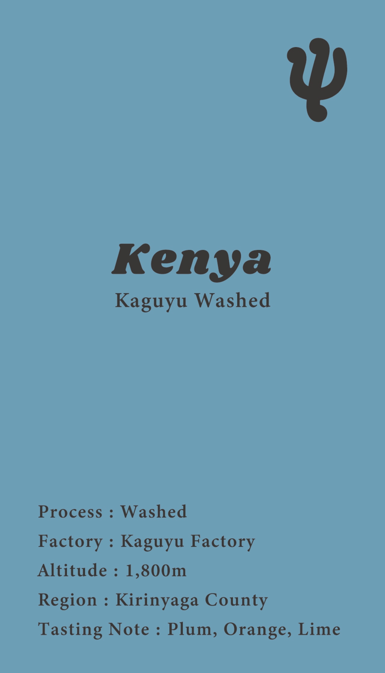 ケニア有数のコーヒー産地、キリニャガ カウンティで生まれたAAグレードのウォッシュドコーヒー。生産を手がけるイノイ生産者協同組合は、約70年の歴史を持ち、カグユを含む11のファクトリーを運営しています。標高1,800mの肥沃な土壌と冷涼な気候で育まれたSL28、SL34、バティアン、ルイル11の4品種は、ケニアらしい豊かな風味を備えています。